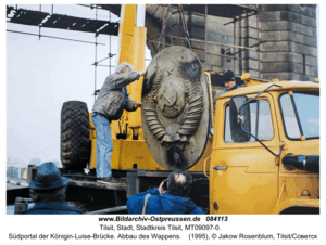 [84113] Tilsit (Советск), Südportal der Königin-Luise-Brücke. Abbau des Wappens 1995