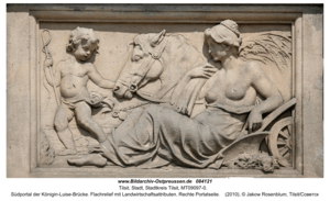 [84121] Tilsit (Советск), Südportal der Königin-Luise-Brücke. Flachrelief mit Landwirtschaftsattributen. Rechte Portalseite 2010