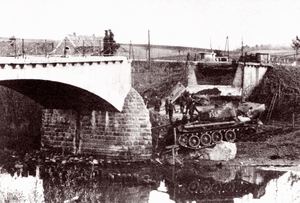 [143762] Nemmersdorf, Gesprengte Brücke mit sowjetischem T 34-Panzer 1944