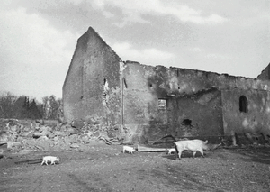 [143763] Nemmersdorf, Durch Kriegshandlungen zerstörtes Stallgebäude mit davor laufenden Schweinen 1944