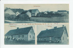 Blumenau Kr. Heilsberg, Ortsansicht, Gasthaus, Schule