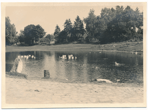 [82530] Rauschken Kr. Osterode, Blick zur ev. Kirche über den Dorfteich 1930 - 1939