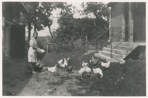 [89686] Schönwiese Kr. Preußisch Eylau, Ort, Hof Gustav Müller I, Beim Hühnerfüttern 1943